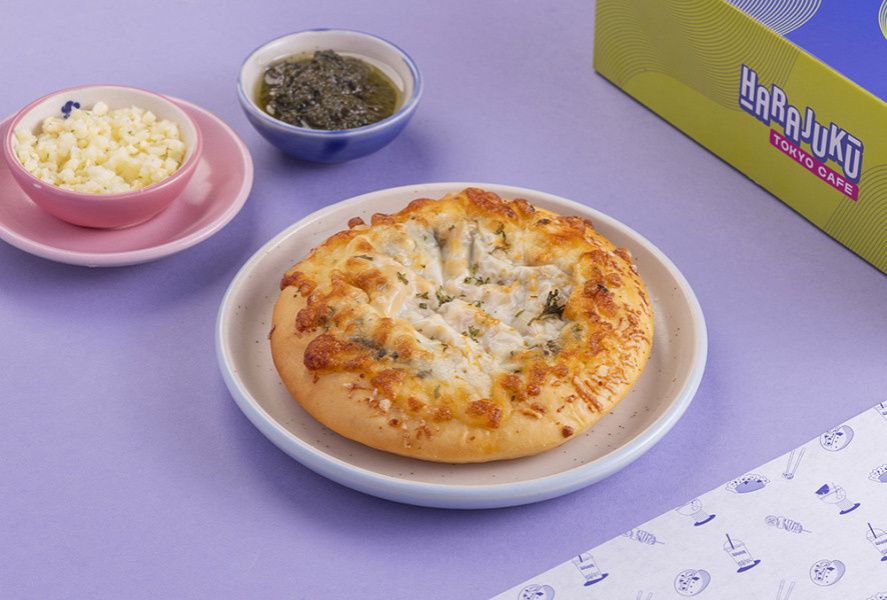 A four-cheese power combo of mozzarella, grated parmesan, cheddar, and pesto-garlic cheese on soft flatbread, topped with pesto and parsley for a fresh, flavour-packed finish.