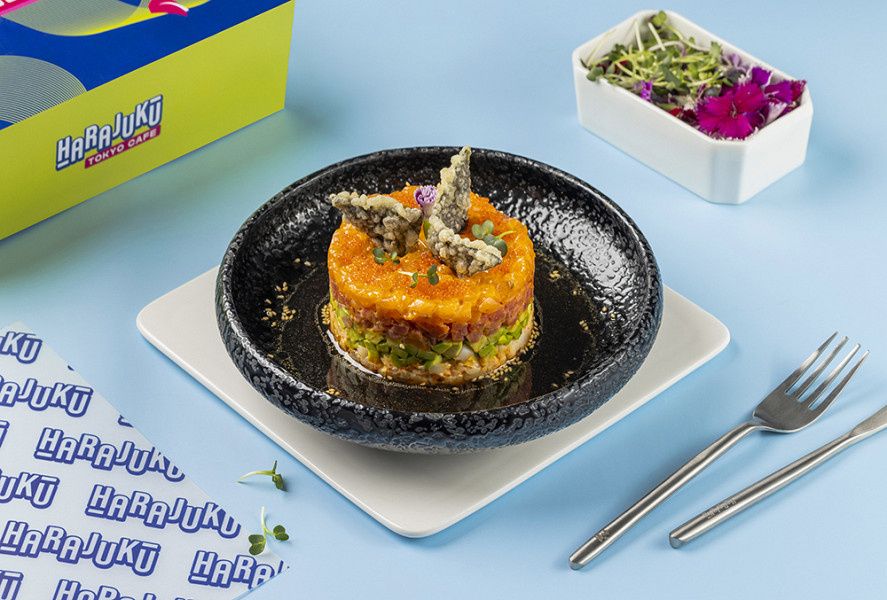 A delicate mix of salmon, prawn, and red tuna, lightly tossed in creamy mentaiko sauce. Finished with orange tobiko and a dash of ponzu, and served with crisp nori nachos.